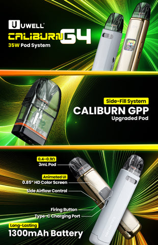 Discover the CALIBURN G4 which is a streamlined pod system with increased flavor, rapid USB-C charging, and a leak-resistant design. It’s ideal for smooth MTL vaping, thanks to its long-lasting battery, ergonomic grip, and easy top-fill pods. Its features are as follows: